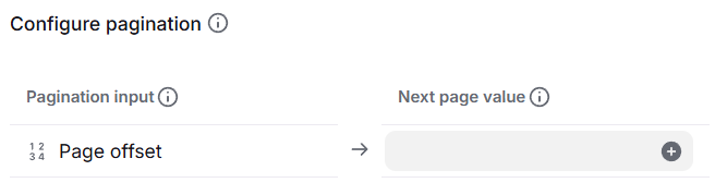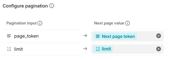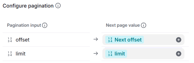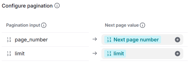 After you enable the toggle, click Add pagination input to define the properties that define pagination. You can determine these from the API documentation of the service you are connecting to. Pagination parameters are typically named things like page_number, limit, offset, page_token, current_page, etc., but you should read the API documentation for the specifics.