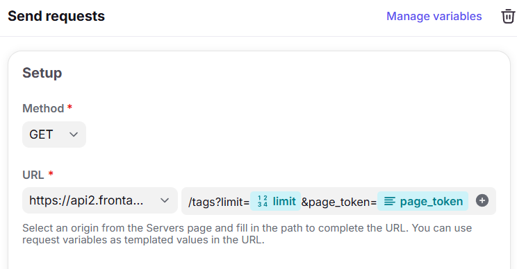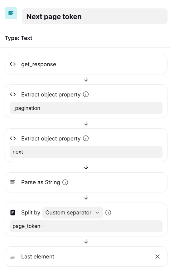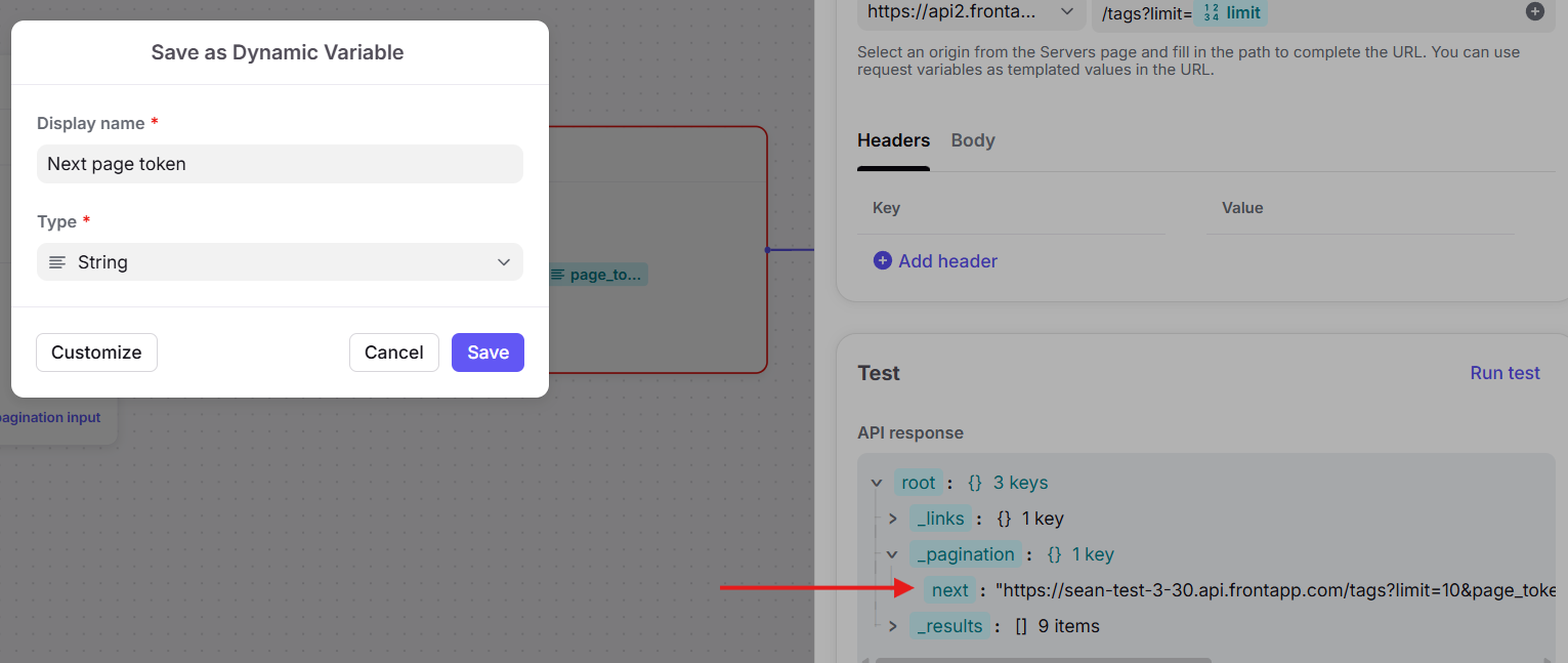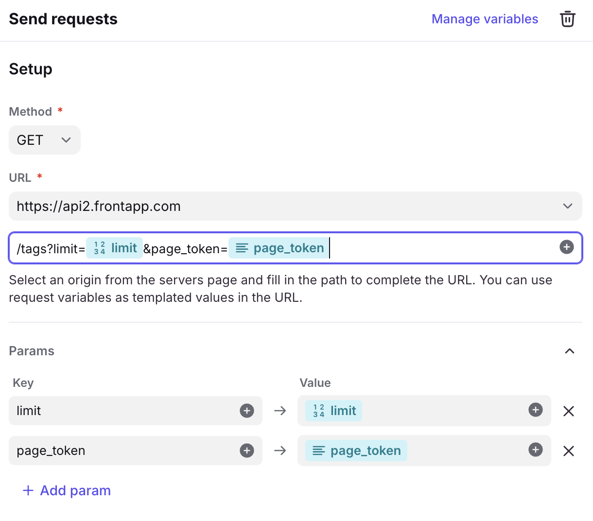 Tip: In some cases, you might have to process the variable further in order to extract the page token from a URL. For example, Front's next property returns URLs like https://api2.frontapp.com/tags?page_token=lkadjsfalsdfjass9889, where the next page token value is lkadjsfalsdfjass9889 and not the full URL. For these scenarios, you can use the dynamic variable system to split the URL value by the page token property name (page_token in the Front example) and equals sign (or whatever other segmentation you need), and then pull just the final part of the URL after that split.