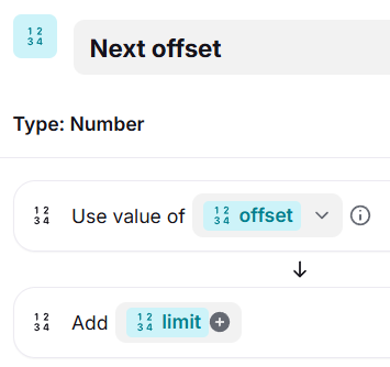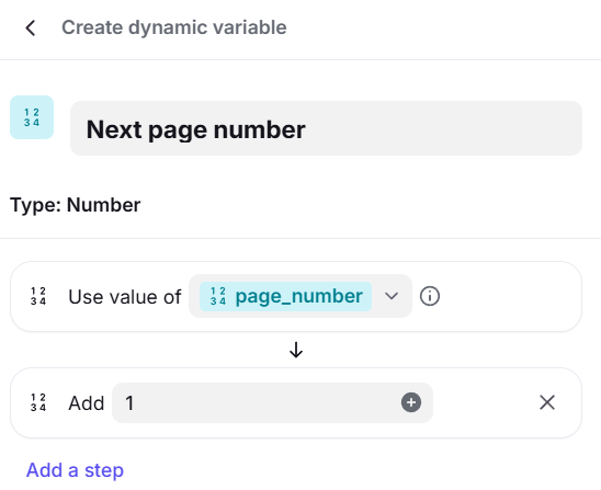 Create a new dynamic variable that modifies the main pagination input (such as adding 1 to a "page number" or a certain increment to an "offset" or replacing the "current page token" with the "next page token").