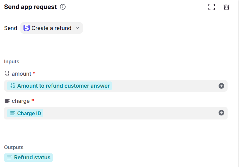 Tip: If the inputs to your app request require that the teammate running the macro supply inputs to the request (such as the amount of money to refund a customer), add a teammate input capture node first by selecting Collect teammate answers.