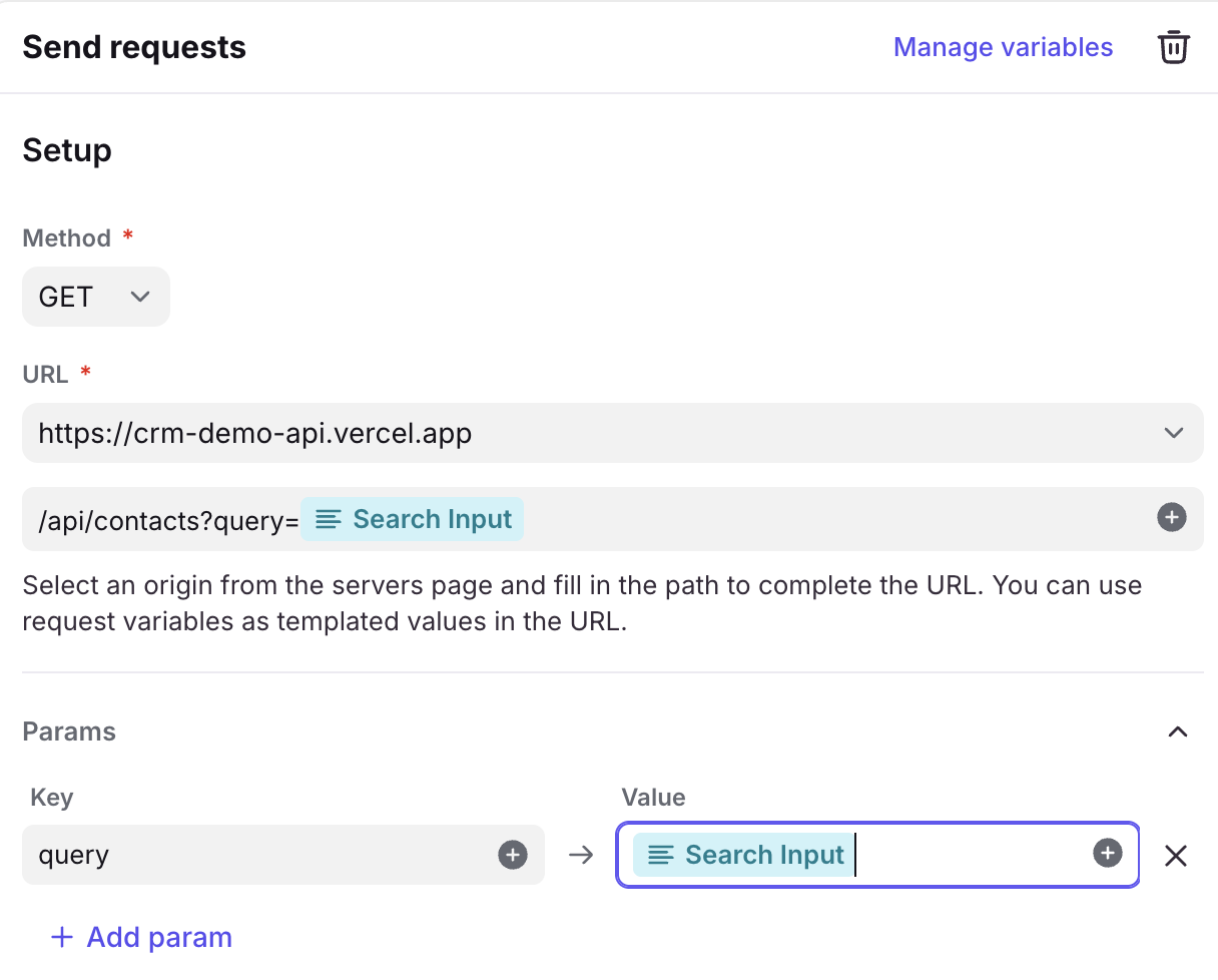 After defining the search input and providing a test value, you need to add the input to the Send request node, usually in the form of a query string parameter within the URL of the request. Consult your API documentation to learn the name of the search input parameter. For example, by reading the docs you might determine that a parameter called query allows you to search through the resources for an endpoint.