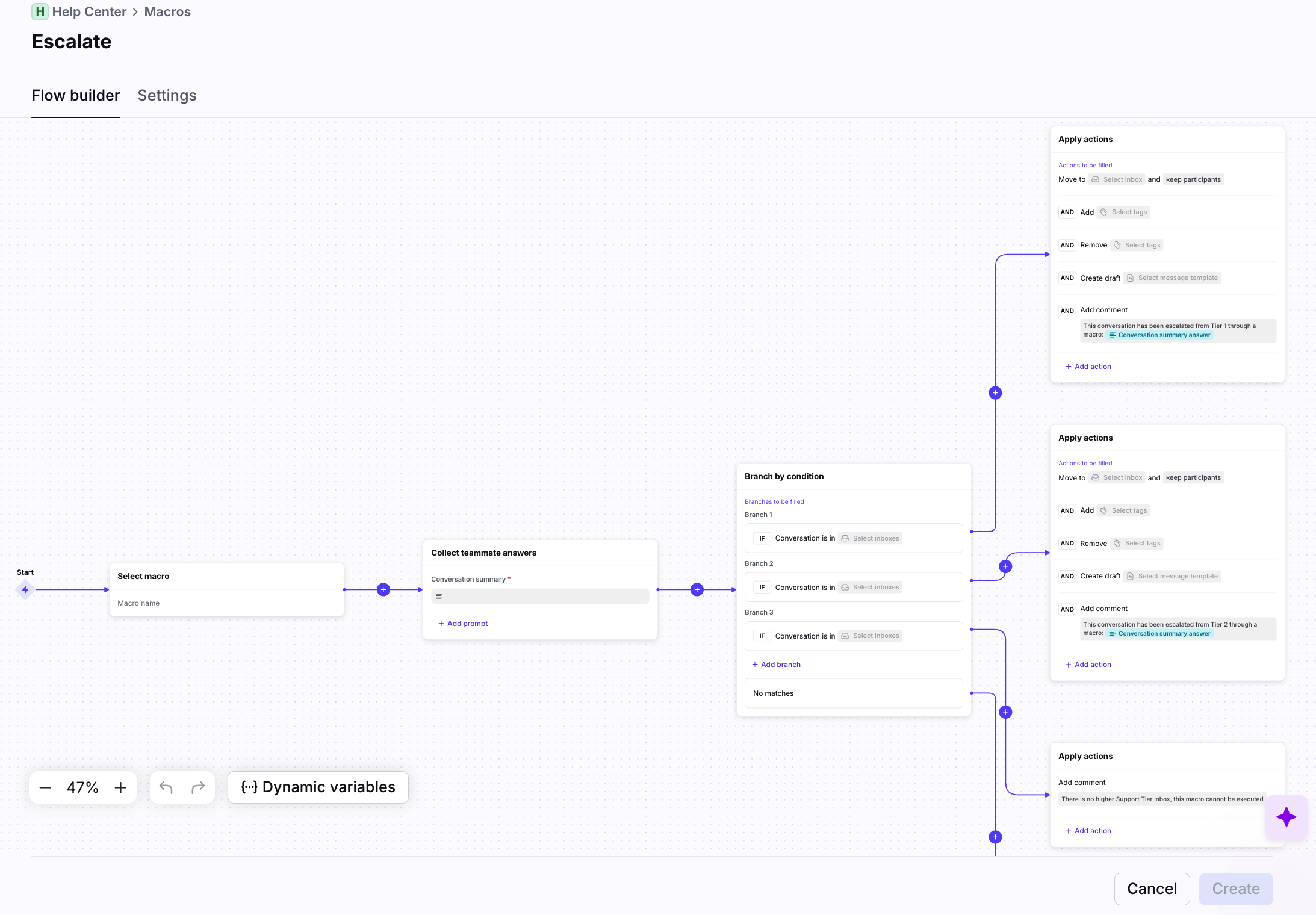 In the Flow builder tab, edit the macro to fit your team’s needs. You can further customize your macro with additional branches or actions.