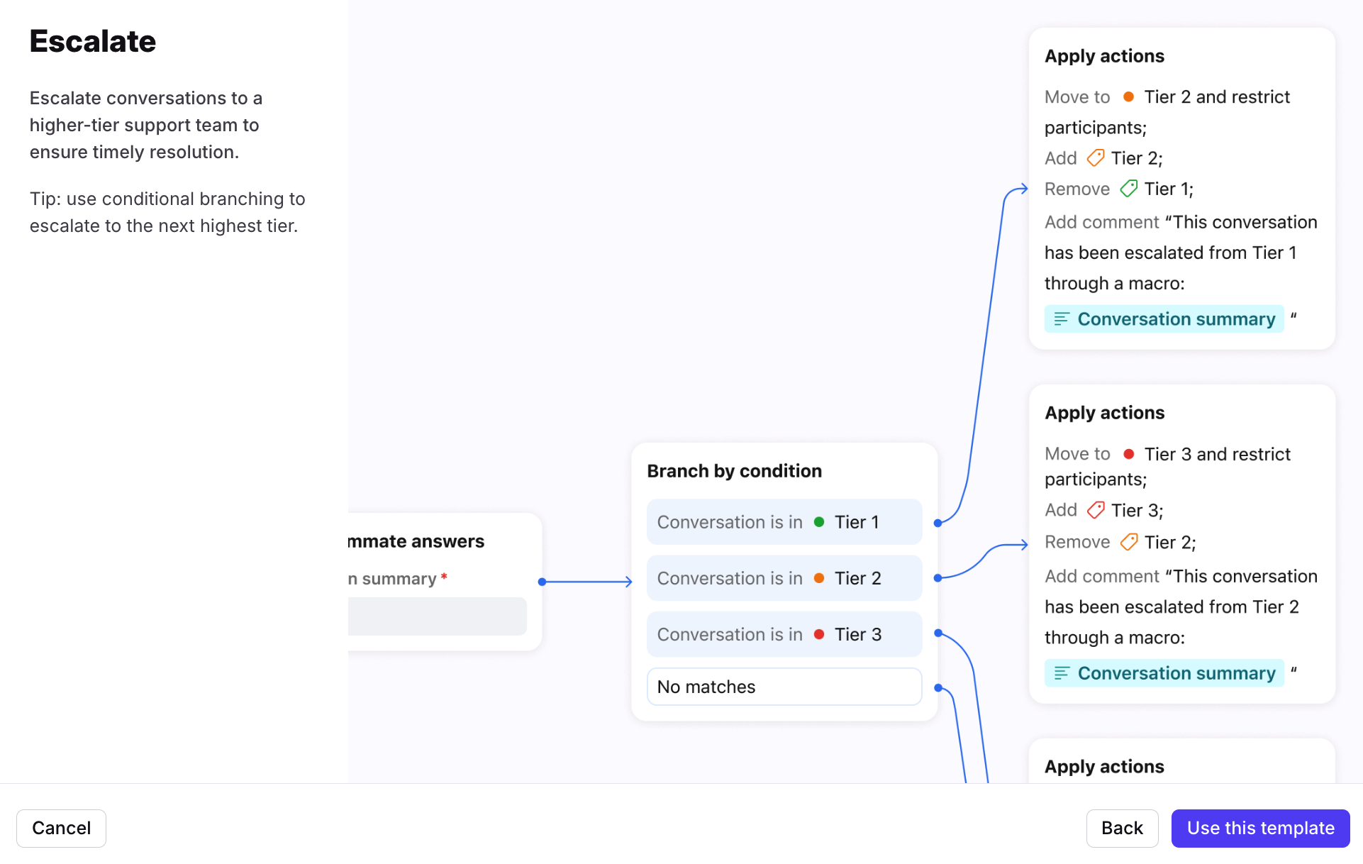 Workspace macros only: Escalate conversations to a higher-tier support team to ensure timely resolution. Establish smooth handoffs when routing customer requests to the appropriate teams.