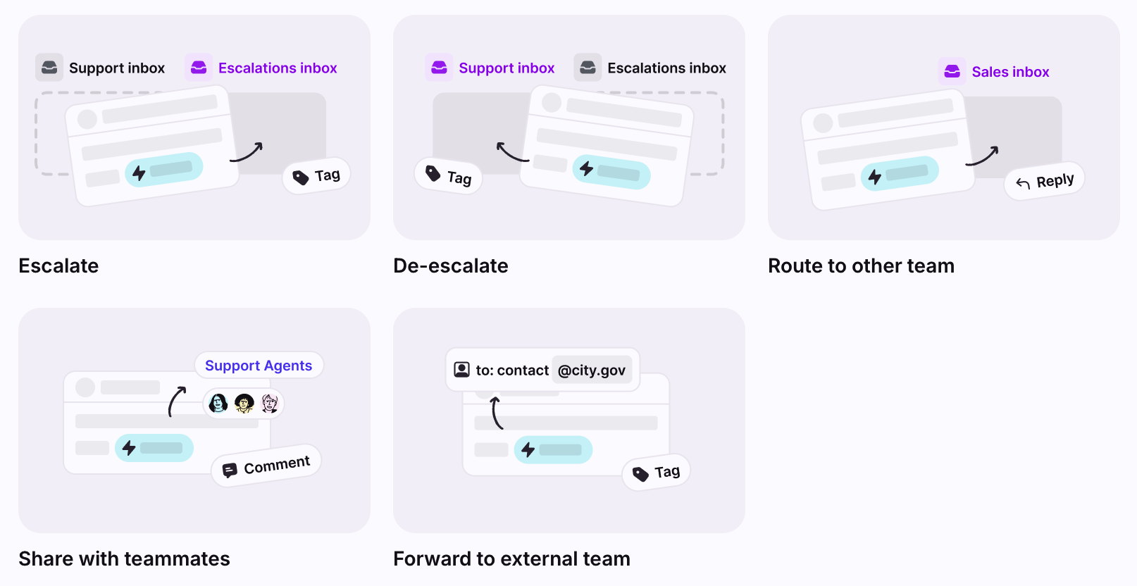 Example: When a teammate working in the Tier 1 inbox triggers an escalation, move the conversation up to the Tier 2 inbox.