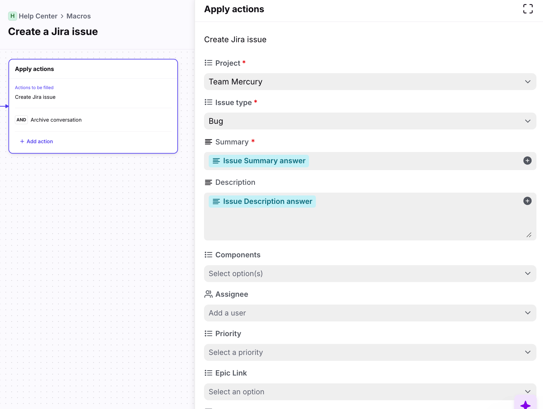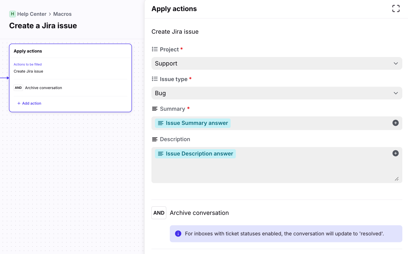 In the conversation, select your Jira macro and fill in the required fields.