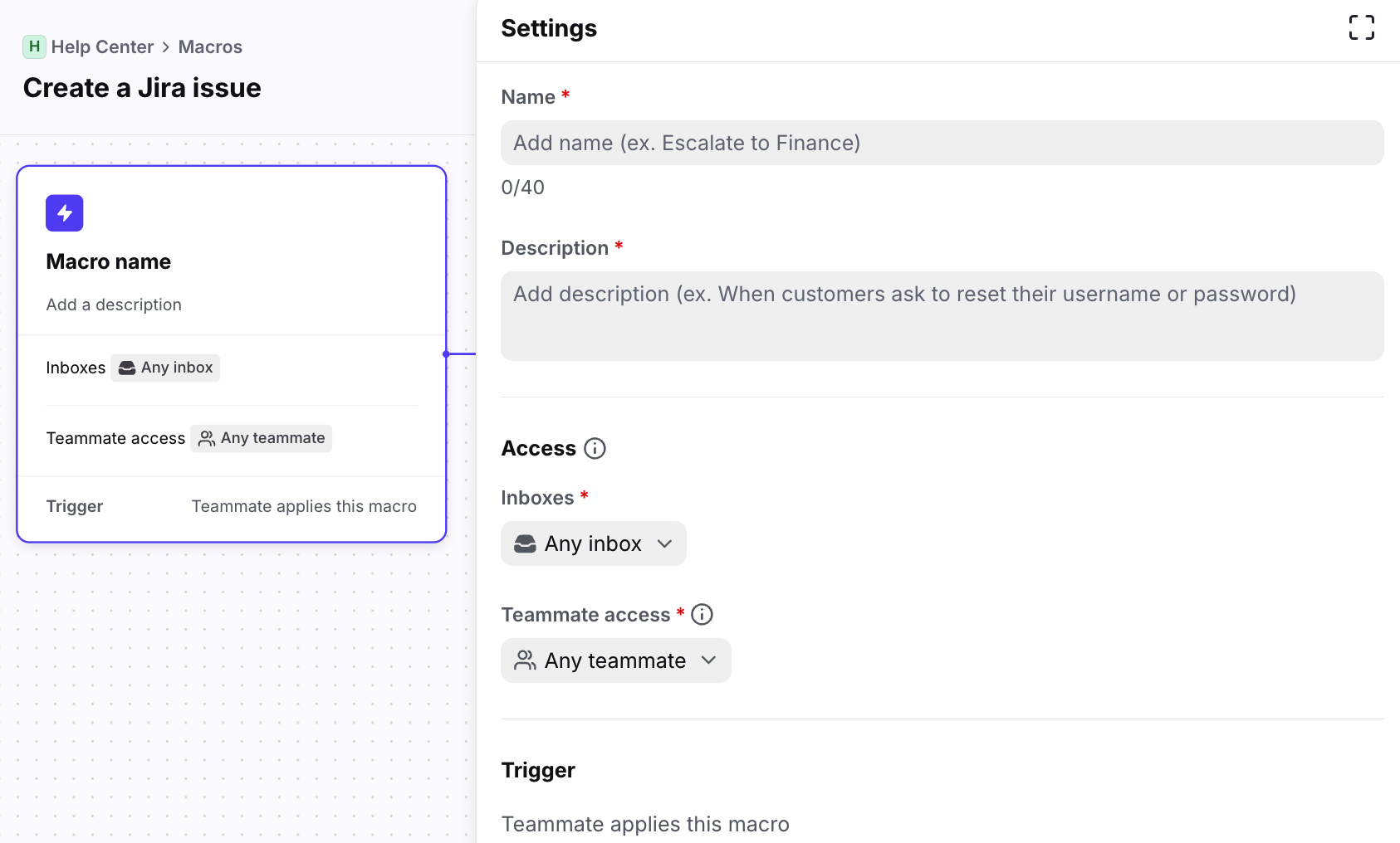 In the settings step, enter a name and description for your macro, then select the inboxes and teammates it applies to.