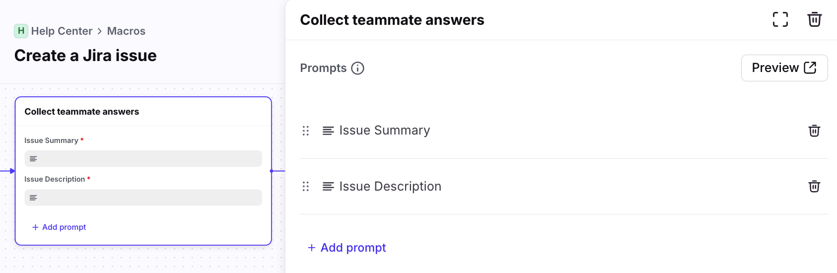 In this example, teammates are required to provide an issue summary and description when they trigger the macro.