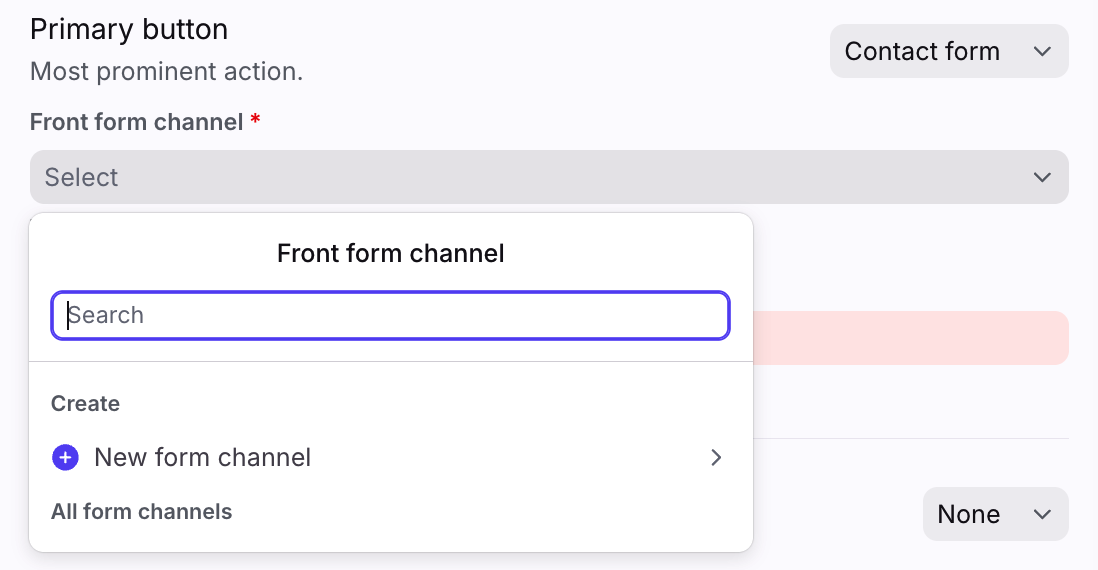 For form channels: In the Front form channel setting, select New form channel to create a brand new channel, or select an existing channel.