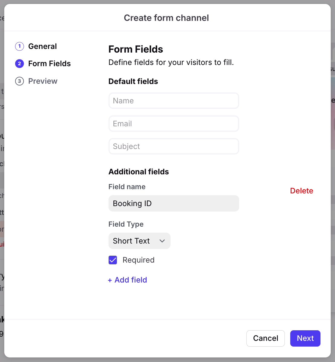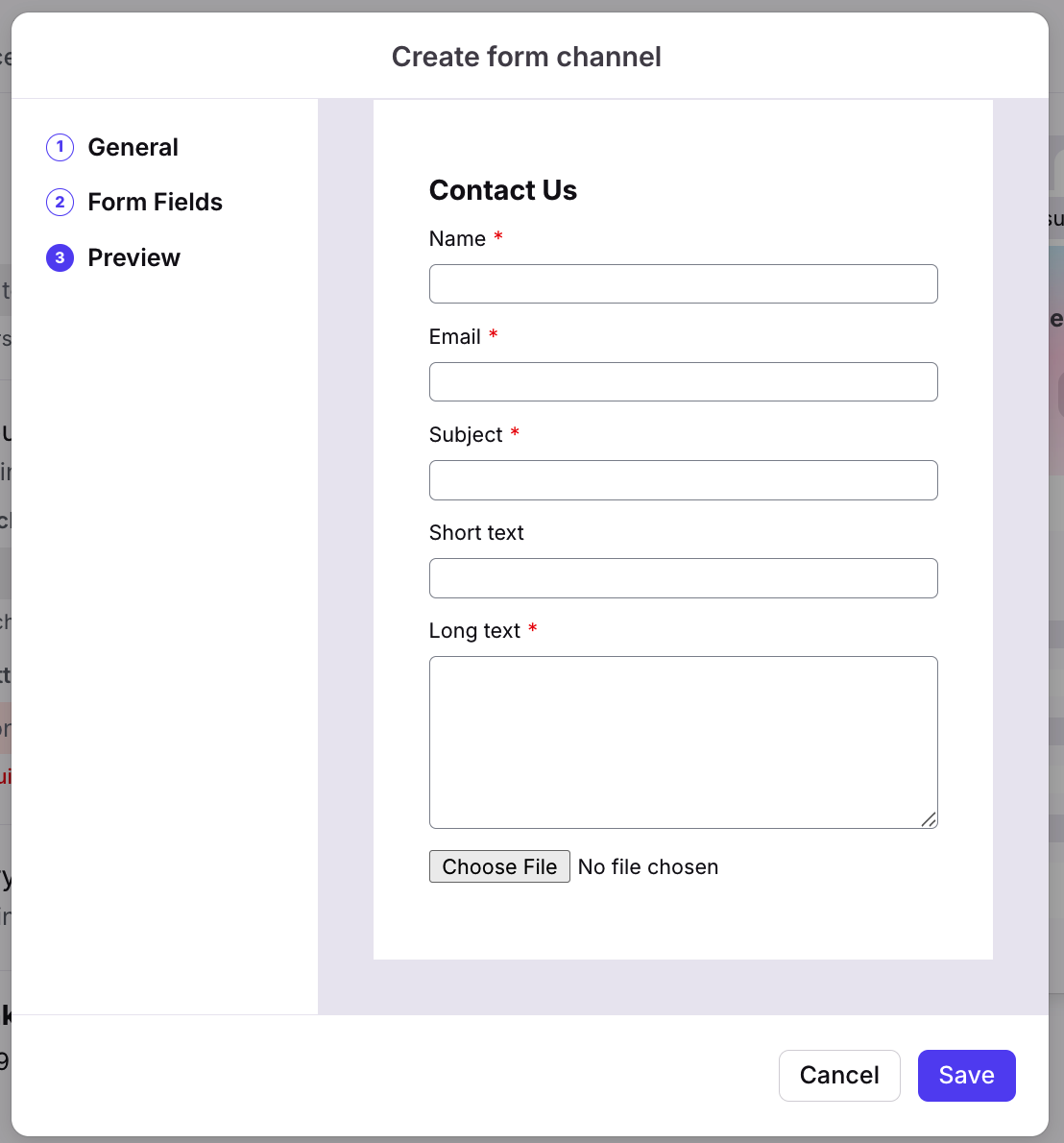 A pop-up will appear. Enter an internal name for the form channel, then select the workspace and inbox the form submissions should route to. This will create a new form channel in the selected inbox.