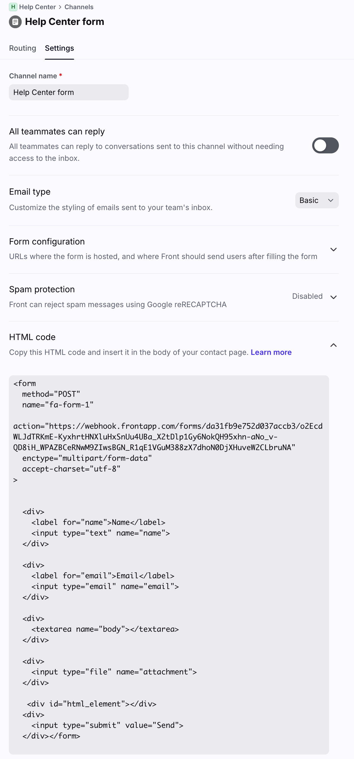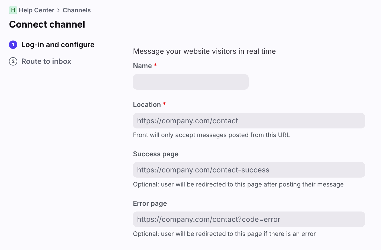 Location: Enter the URL where your form will be hosted. We provide the HTML for this form in a later step. As a security precaution, Front will only accept messages posted from this URL. This can be changed later if needed.