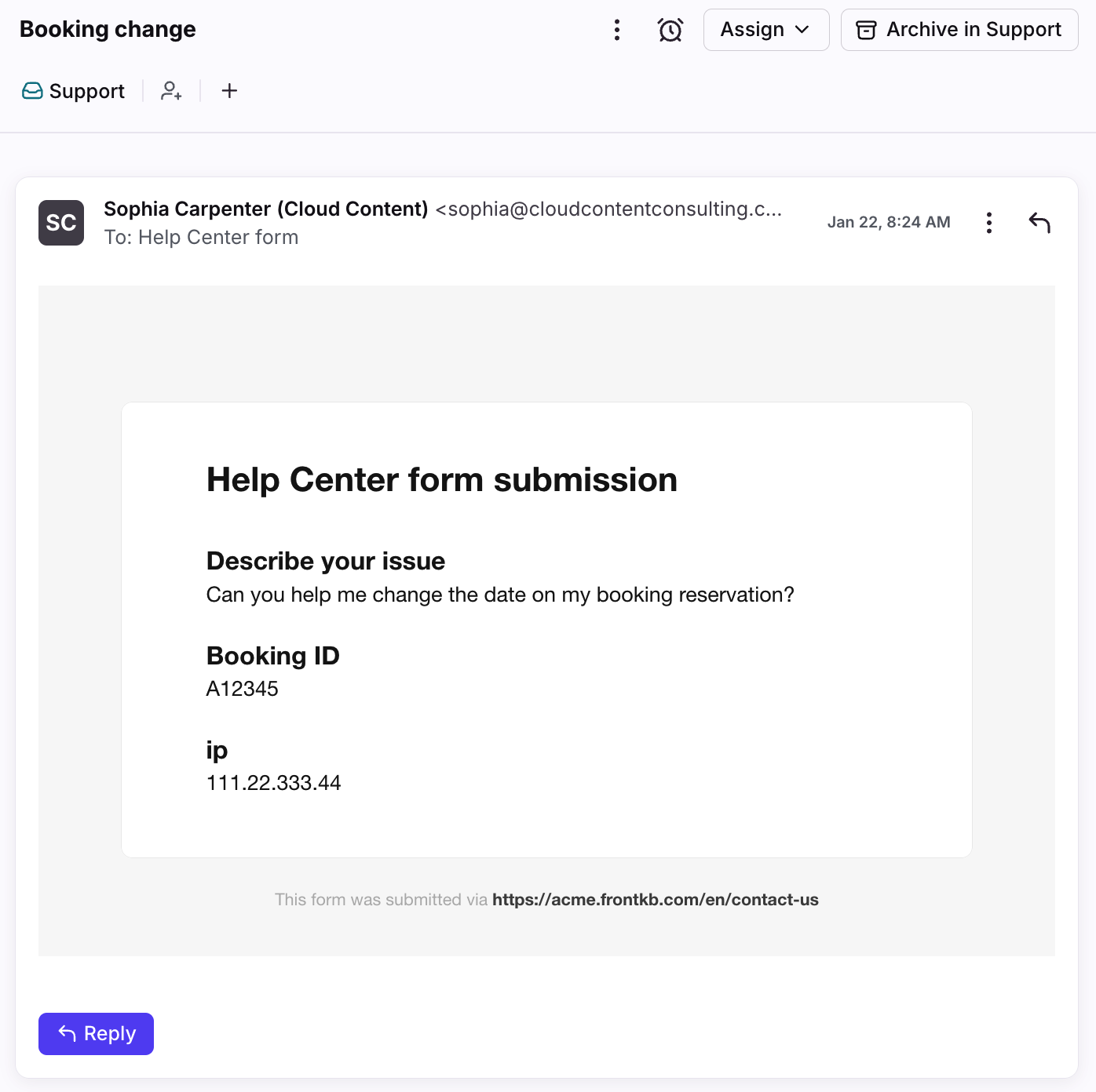 If your form contains a subject field, it will be used to define the subject of the message in Front. Otherwise, you can define a default subject in your settings. The subject will be used if you reply from Front.