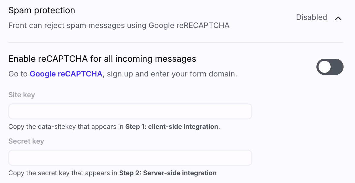In Front, navigate to your channel settings and expand the Spam protection setting. Toggle on Enable reCAPTCHA for all incoming messages and enter the site key and secret key values copied from Step 3.