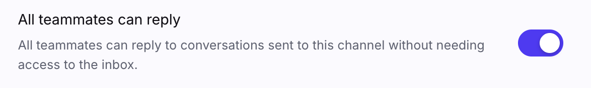 If turned on, any participant of a conversation using this channel can reply using this channel, regardless of if they have access to the inbox where the channel lives. However, only teammates with access to the inbox where this channel lives can start a new conversation using this channel.