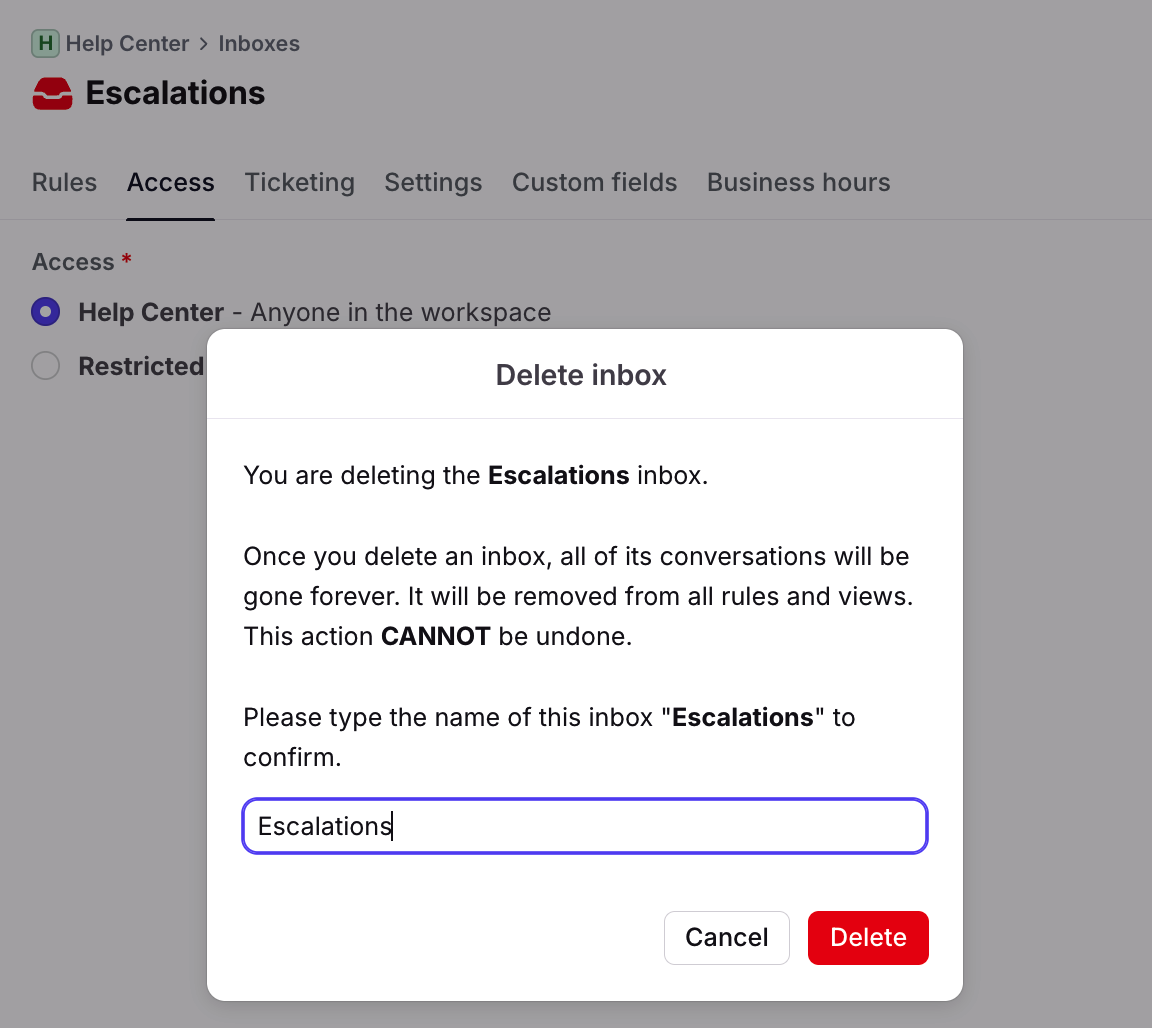 You will see a confirmation screen telling you that all conversations in the inbox will be permanently deleted and it cannot be undone. Type the name of this inbox then click Delete to confirm.