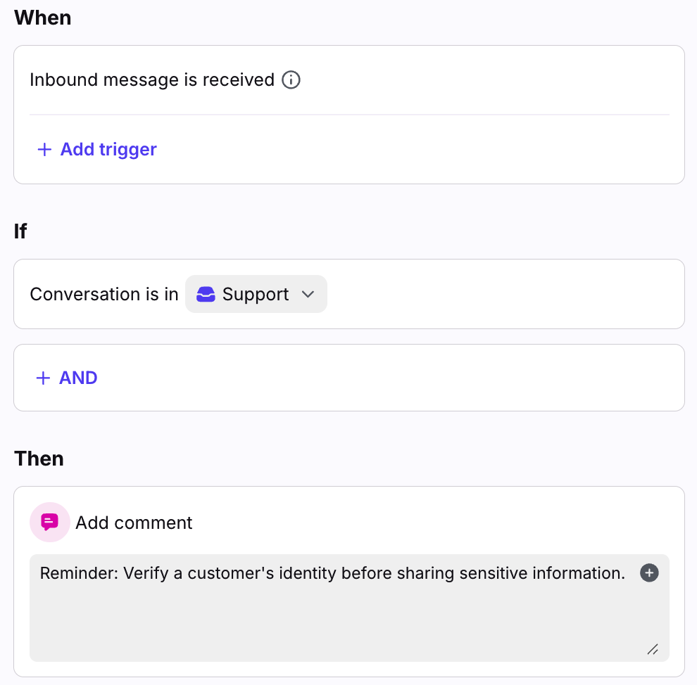Automatically add a comment to the conversation, including mentioning teammates by typing the @ symbol and their username. You can also use Markdown to format the comment that your rule will post.