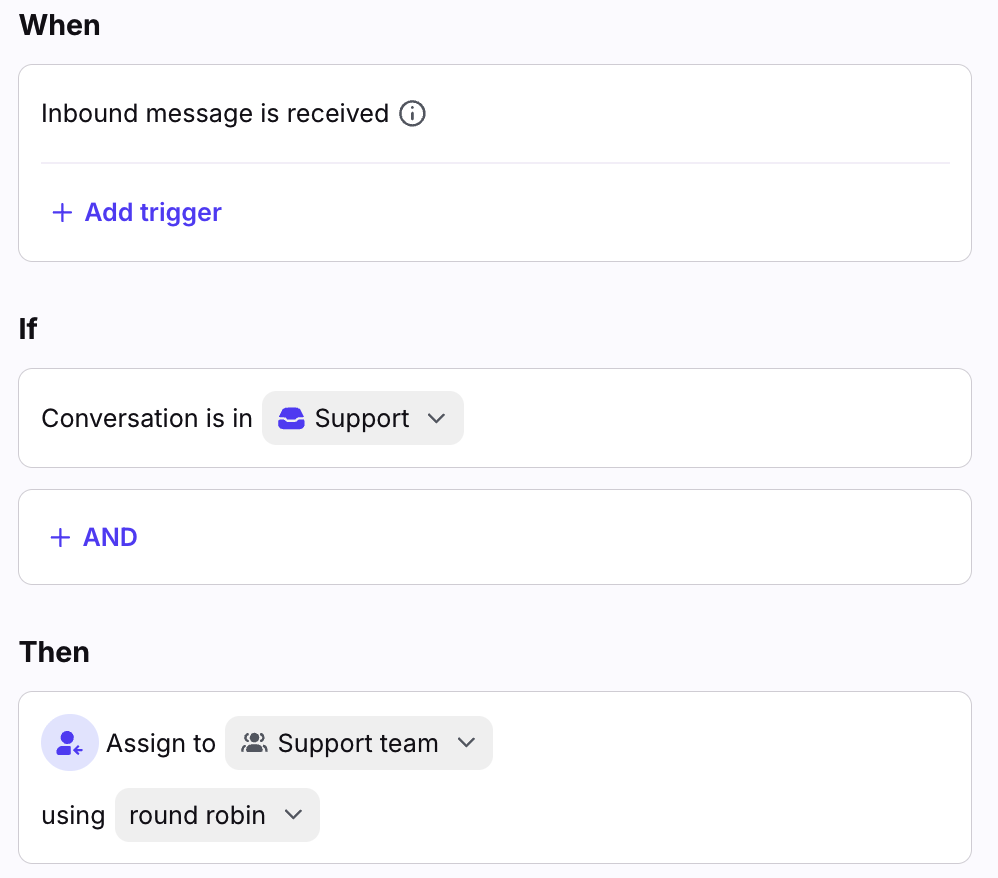 Evenly disperse messages among a group of teammates by automating assignments with round robin rules. See this article to learn more about round robin vs. load balancing rules.