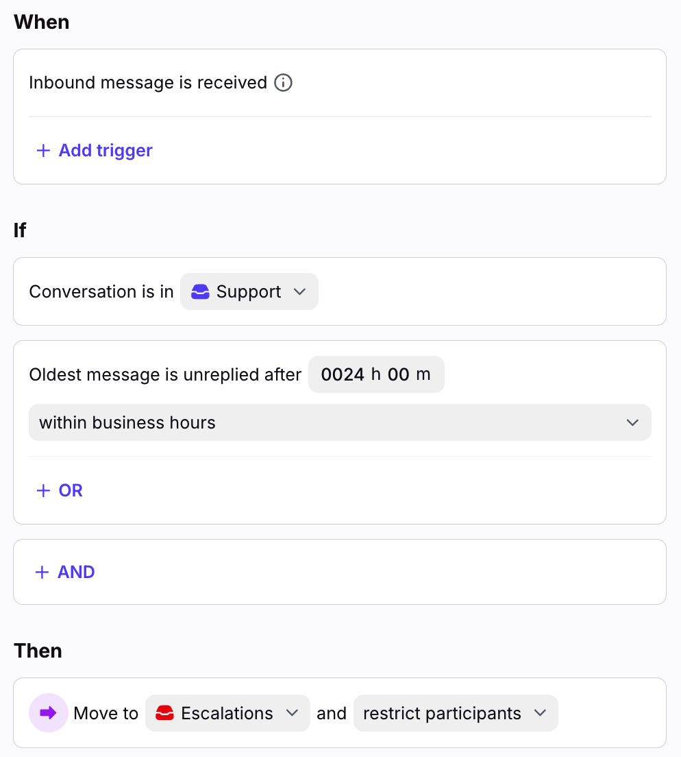 If a rule moves a conversation that is currently assigned to a teammate into an inbox that the assigned teammate does not have access to, then the conversation will automatically be unassigned from the teammate to respect their level of access.