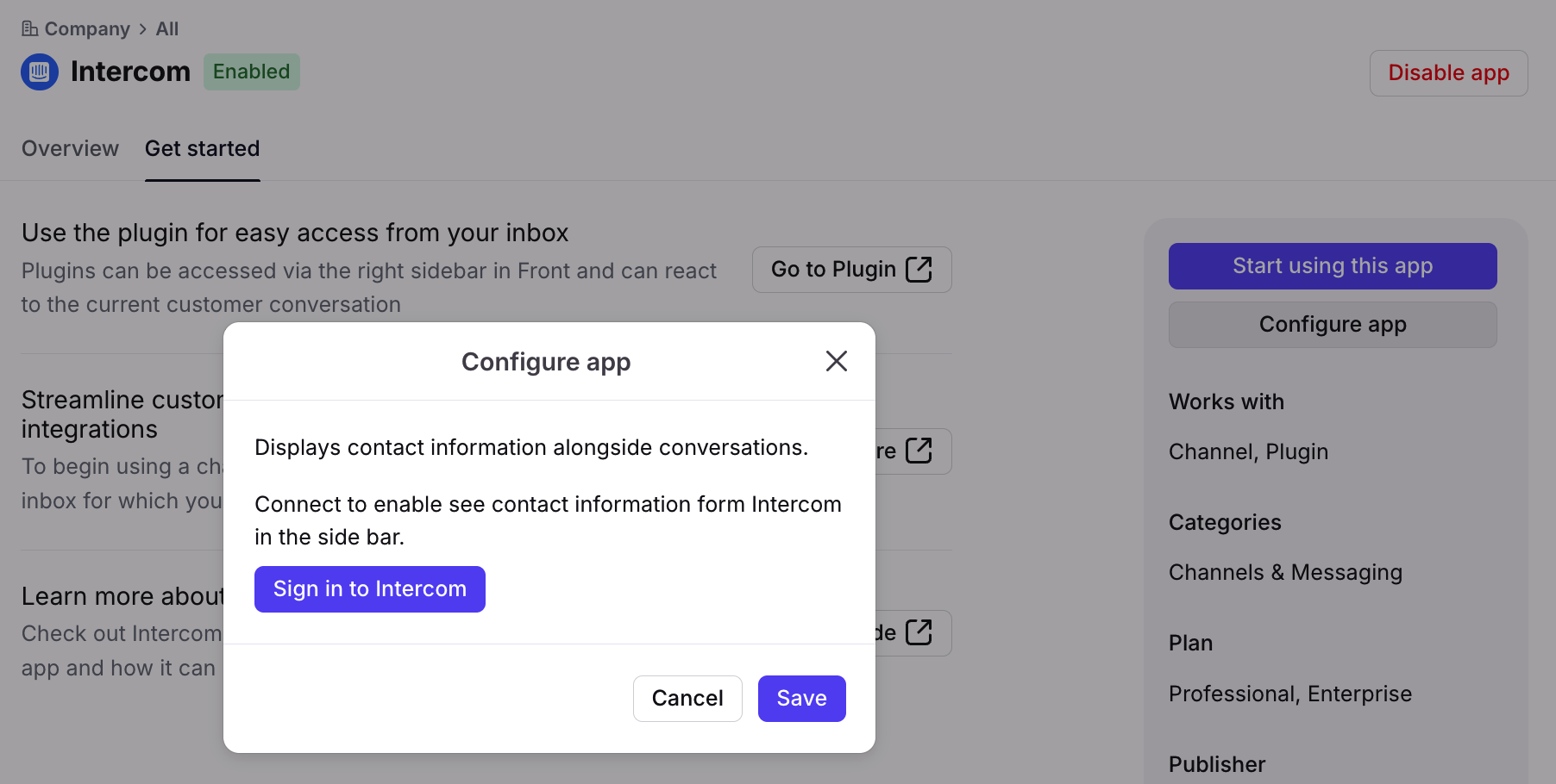 In the pop-up window, click Sign in to Intercom. Enter your account credentials, then click Save.