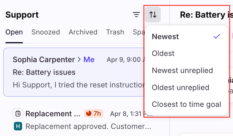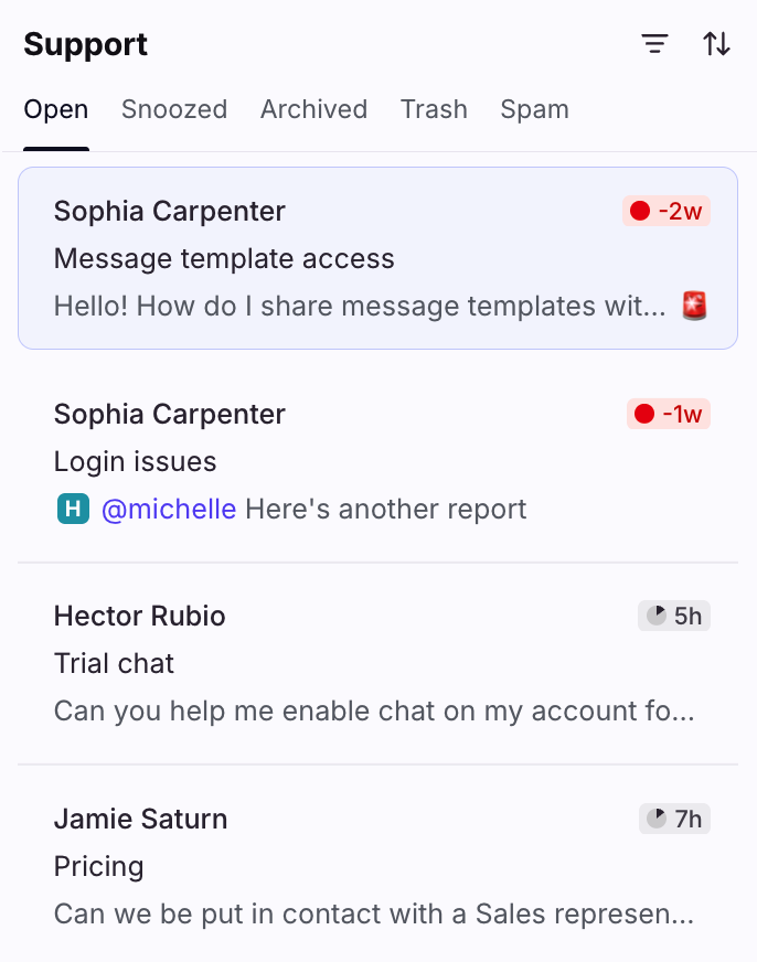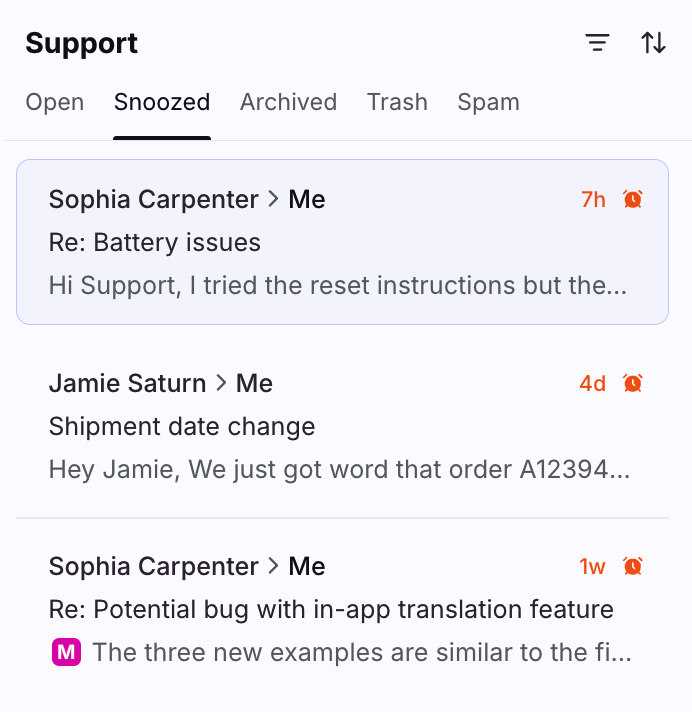 Snoozed tab only: The conversation with the shortest snooze timer expiration will be listed at the top in chronological order, down to the conversation with the longest snooze expiration.