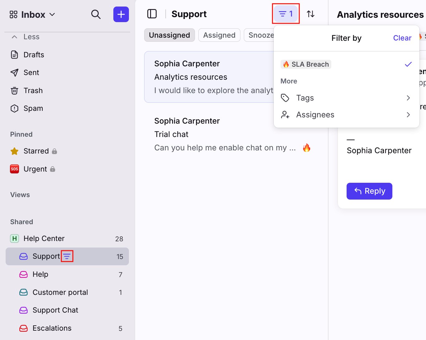 Filter indicators will be visible in both the conversation list and in your sidebar. You can have different filters selected per inbox.