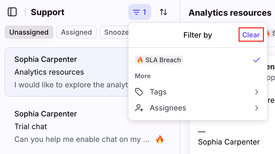 Filters will stay applied until you manually clear them. To remove a filter, click the filter icon at the top of the conversation list, then click Clear.