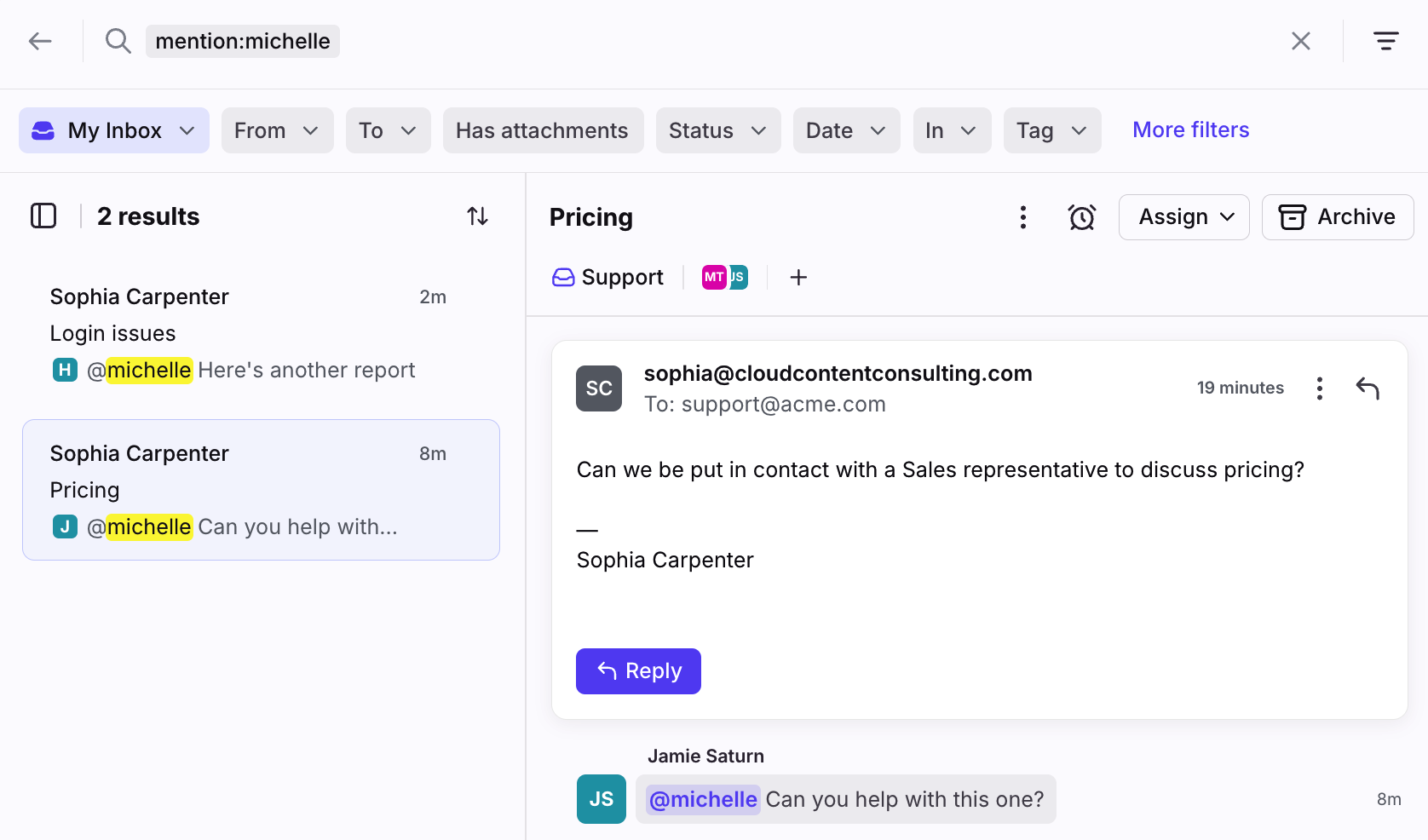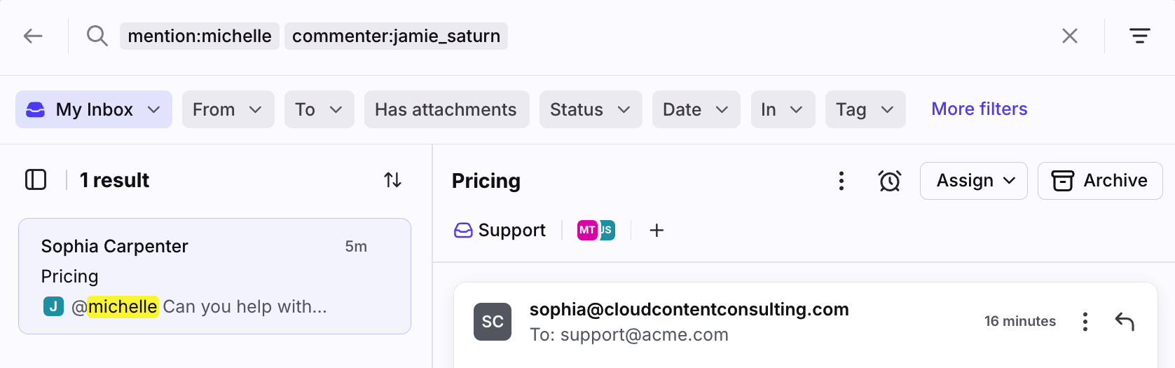 You can add to the above query by including the teammate: search modifier to also search comments from specific teammates. You can stack search filters to find conversations where you might have been mentioned by a specific teammate.