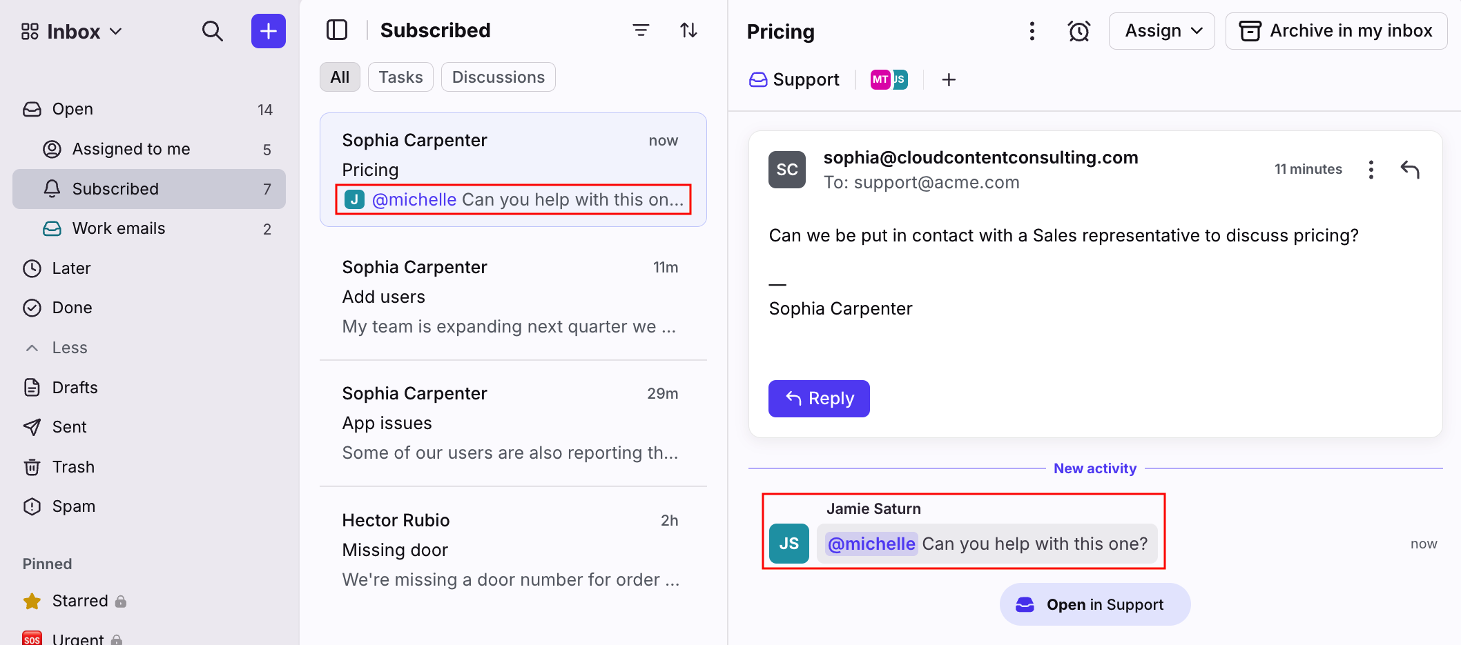 All notifications from teammates in Front are visible in the Subscribed section in your sidebar. Any time you're @mentioned on a conversation using comments, it will bump to the top of your Subscribed section.