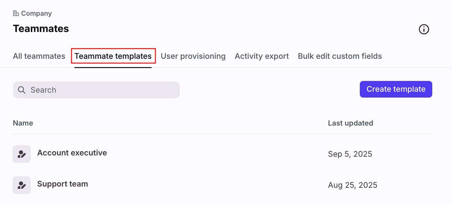Click the gear icon and navigate to company settings. Click Teammates in the sidebar, then select Teammate templates.
