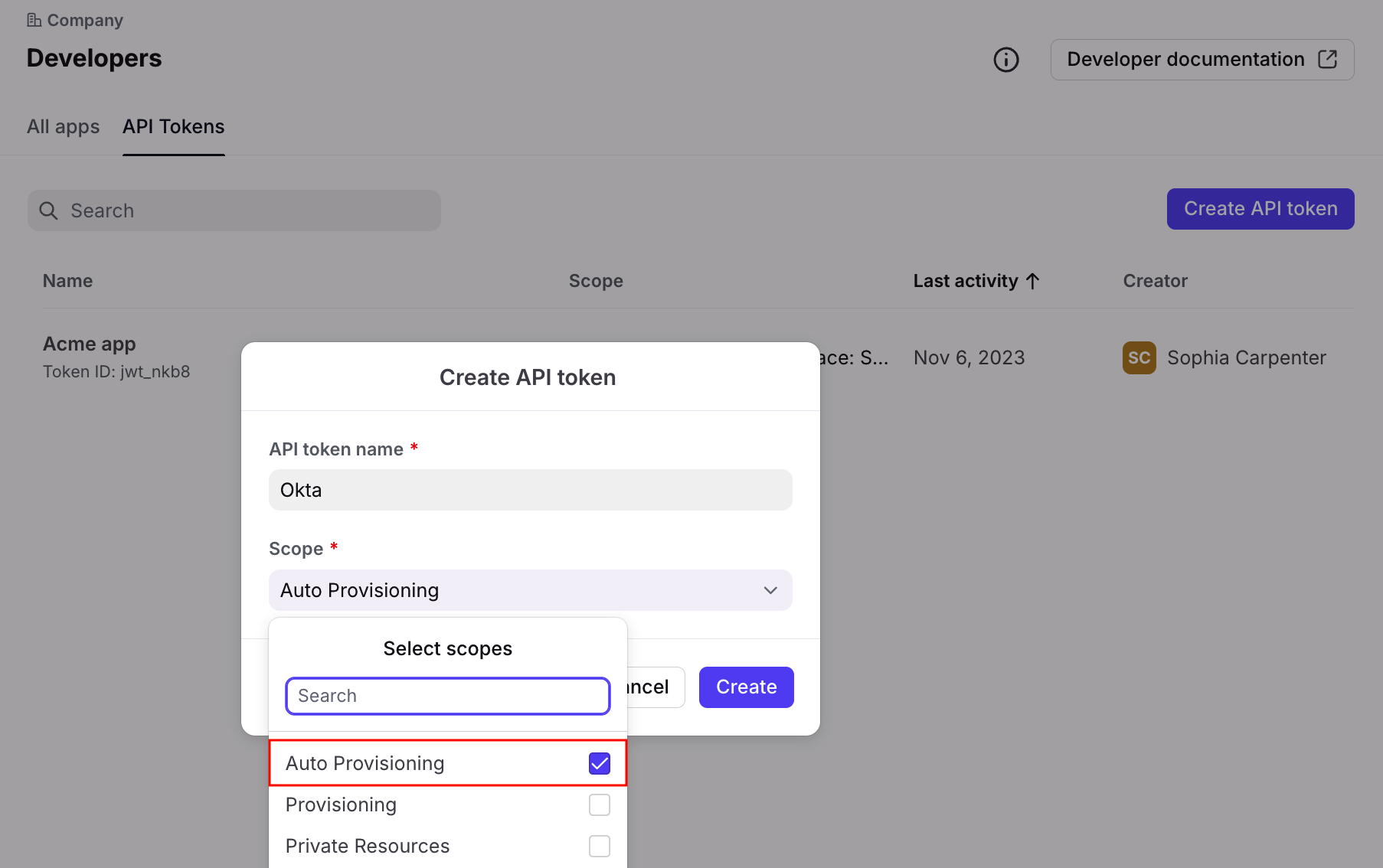 On Step 5 of creating a token, select the Auto Provisioning Scope.
