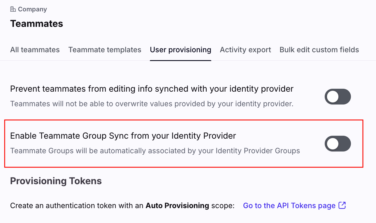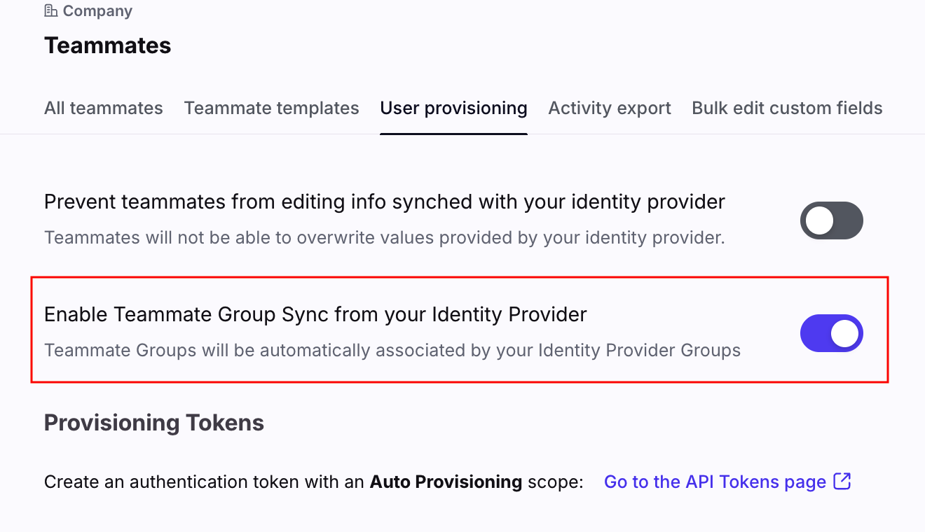 If you want to push groups from your Identity Provider to teammate groups in Front, select Teammates in the navigation sidebar. Select the User provisioning tab, then toggle on the Enable Teammate Group Sync from your Identity Provider setting.