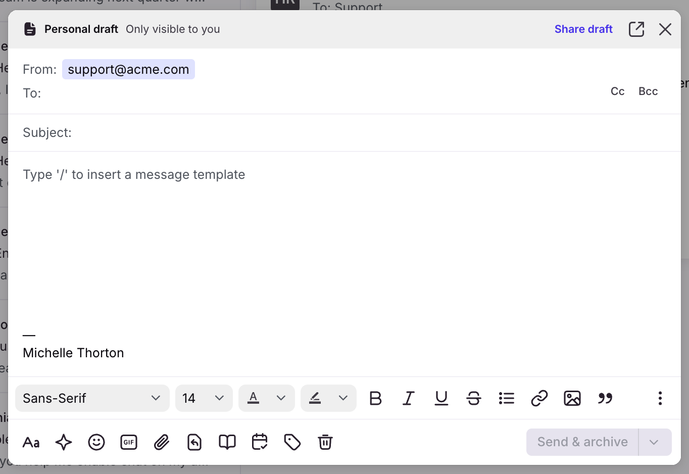 Compose your message in the pop-up. If you close the window before you send, you'll be prompted to save your draft. Learn more about Front's composer here.