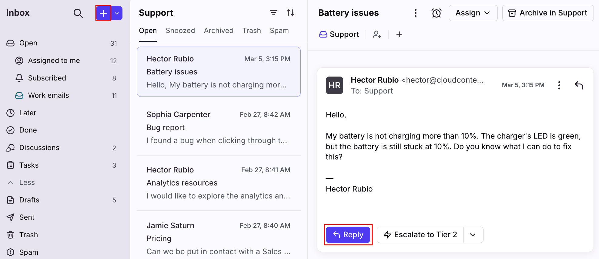 To compose a message, click the plus icon (+) at the top left corner, or click Reply on a message.