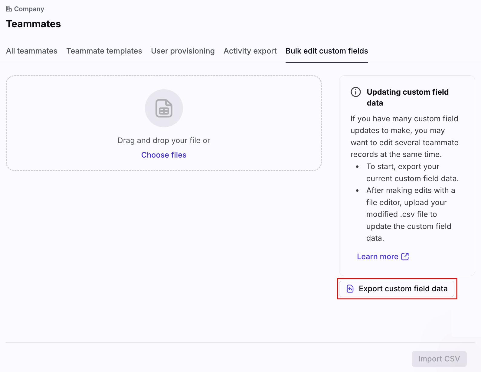 You can export a template containing your list of teammates and any existing custom teammate fields using the export instructions below.