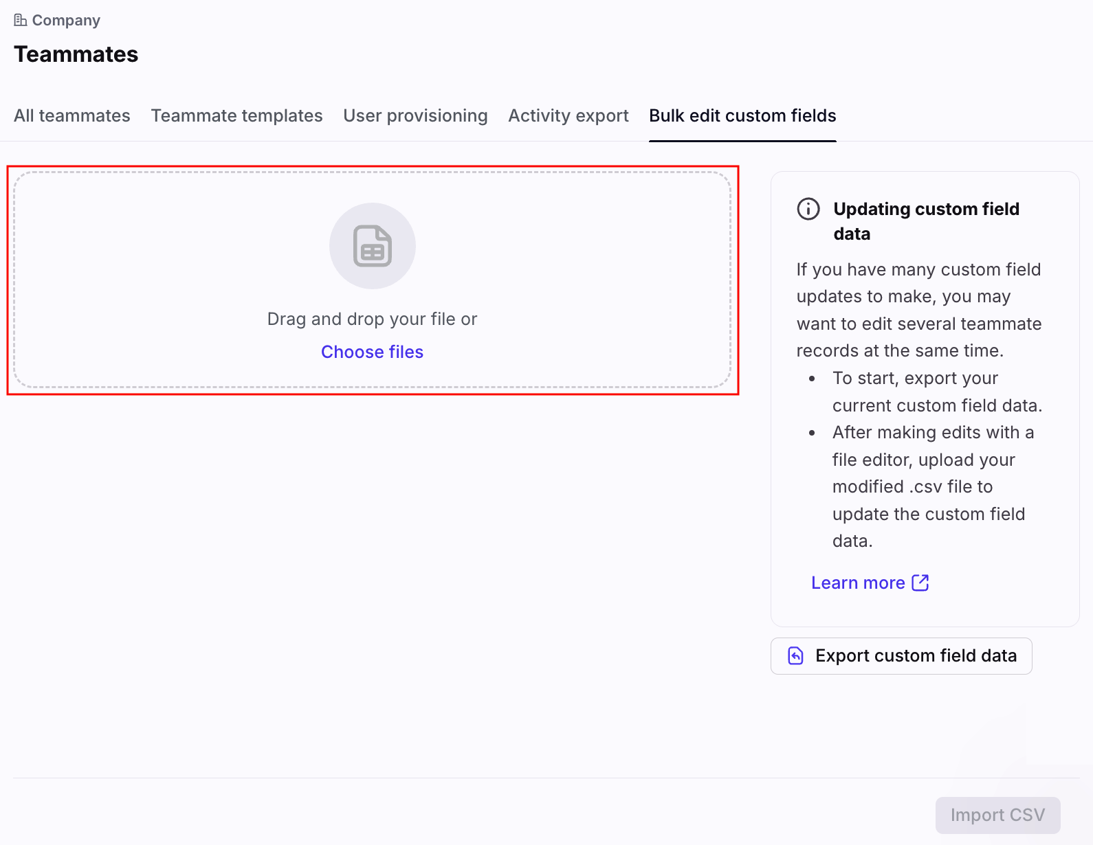 Click Choose files in the Bulk edit custom fields tab and select your file. You can also drag and drop your file from your computer into this section.