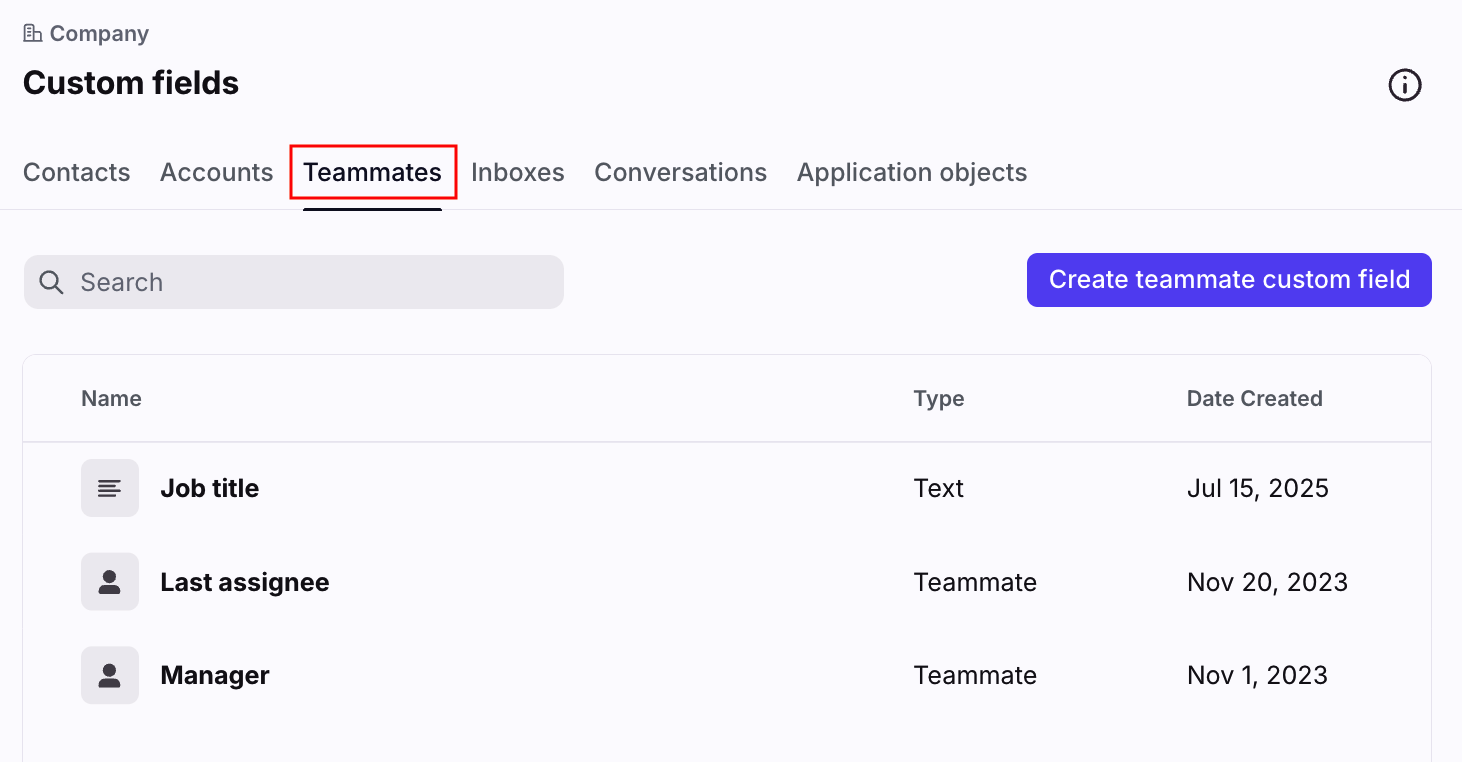 name of your custom teammate field, e.g. Manager | Custom fields | Depending on the type of custom field, this could be a string, number, boolean, date time, or teammate email | You can add columns for any of the custom teammate fields you’ve set up. |