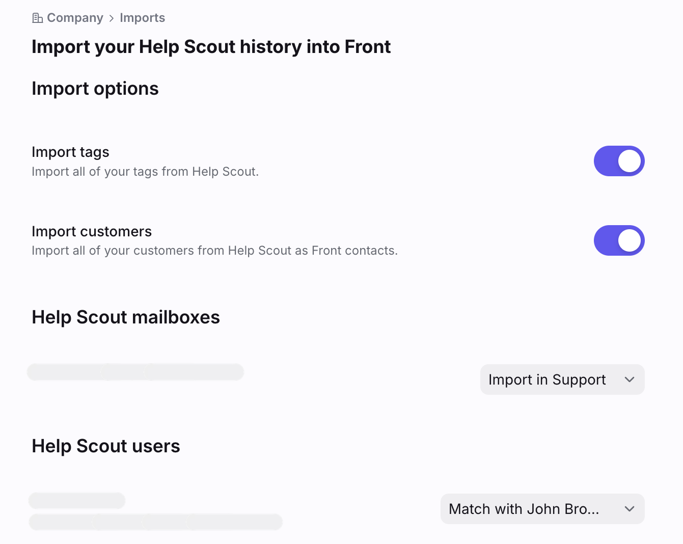 Choose whether you'd like to import your Help Scout tags to Front, and if you'd like to import your Help Scout customers as Front contacts.