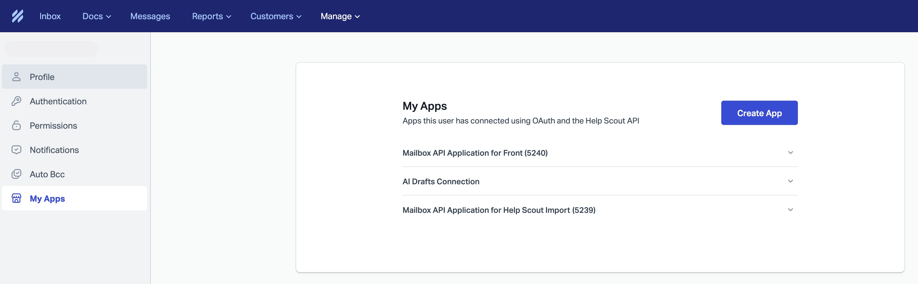 Log in to your account via the Help Scout website, then select Manage in the top navigation bar.