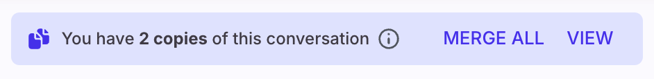 When these cases occur, Front will show you a banner at the bottom of all relevant copies of the conversation you have access to, and you will be able to click Merge all to directly merge these copies, or click View to see what these copies are. Once duplicates are merged, all participants from all copies will be on this one copy.