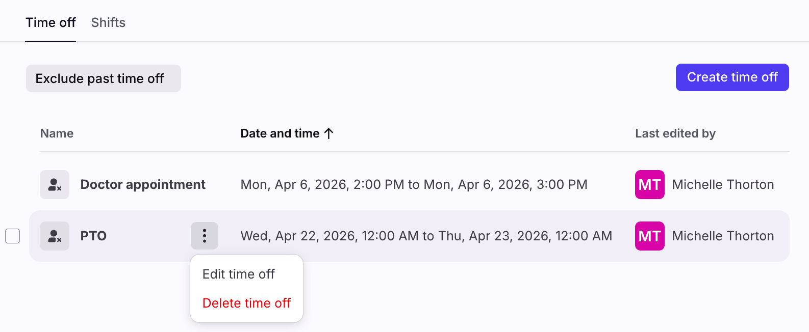 You can edit or delete your time off at any time by clicking on your time off, or using the three-dot menu.