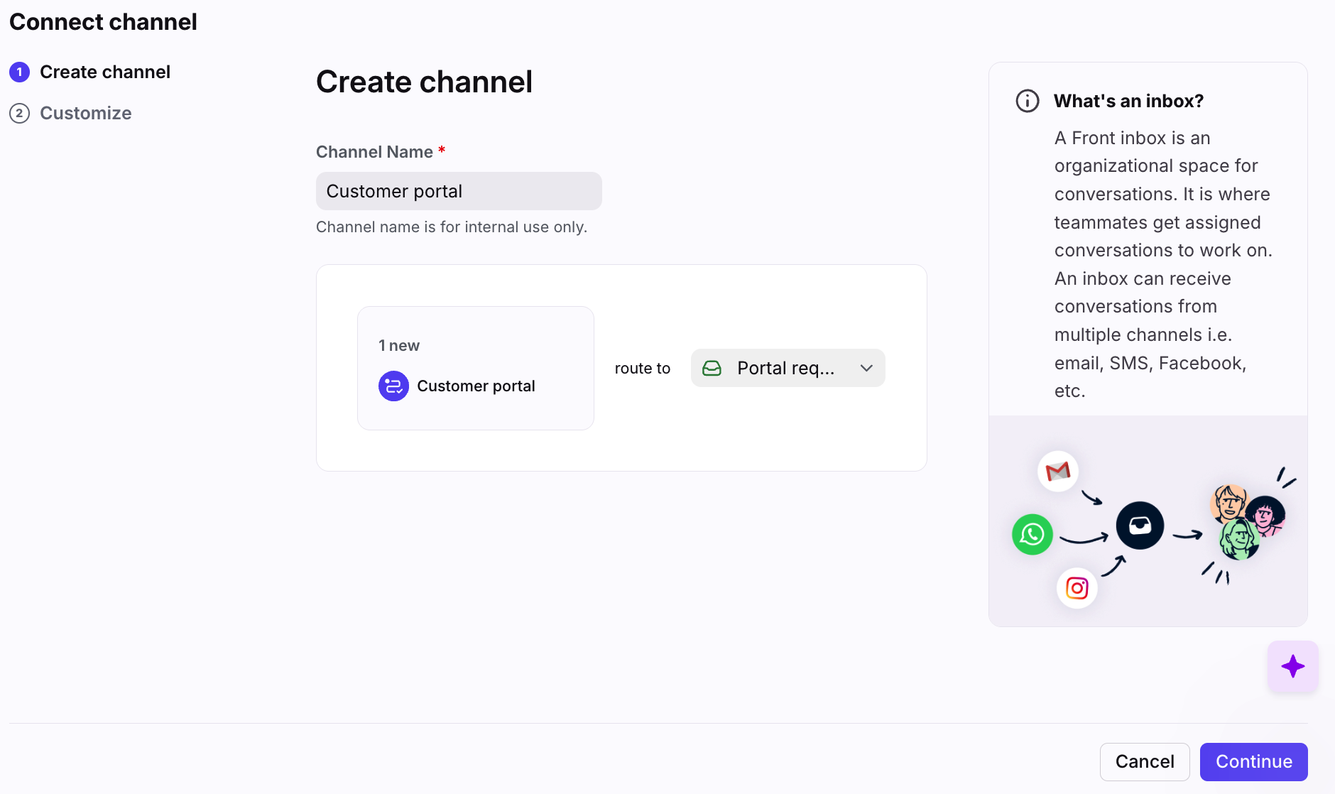 Give your new channel a name and select the inbox that should receive requests. Click Continue.