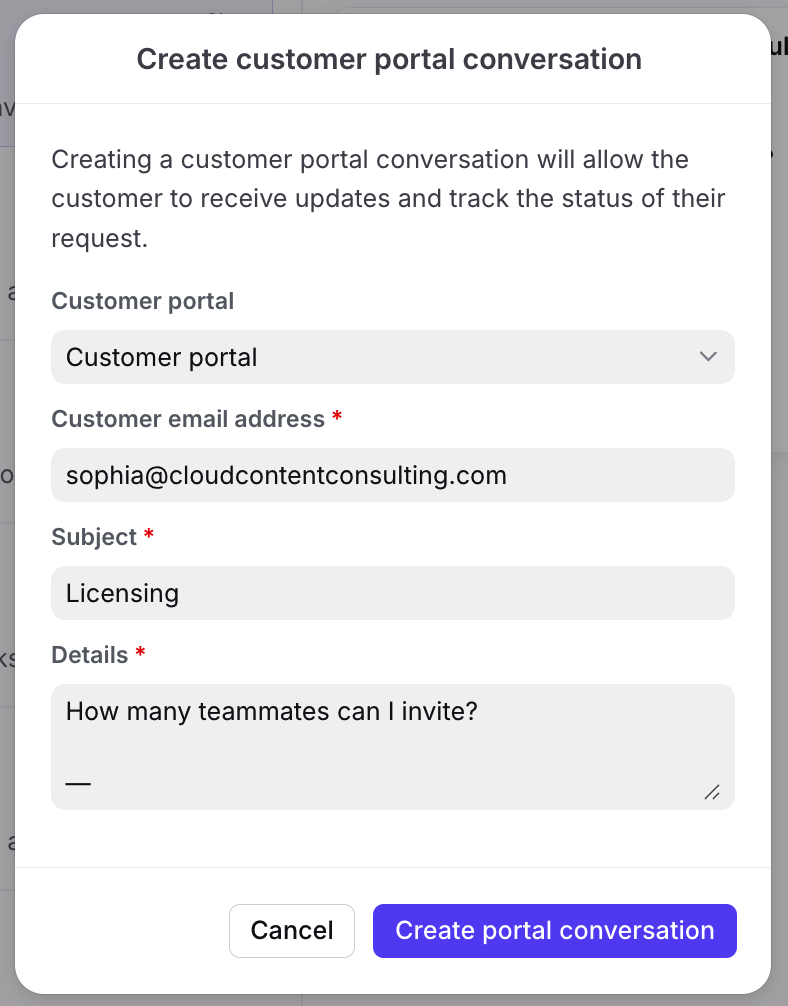 A pop-up will appear. Review the prefilled details pulled from the message, adjust any fields as needed, then click Create portal conversation.
