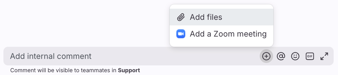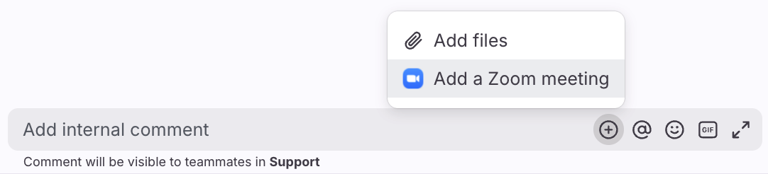 Insert a unique Zoom link directly into a comment by clicking the + icon in the comment bar and choosing Add a Zoom meeting. This enables instant video or audio collaboration as you are working on a conversation together in Front.