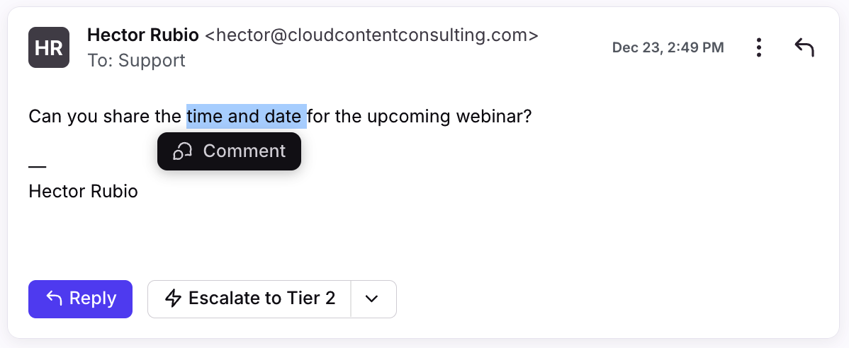 Multiple teammates can highlight and comment on text within the same snippet of a message. The message body will indicate when there are overlapping comments. Click any highlighted segment to preview the associated comment.