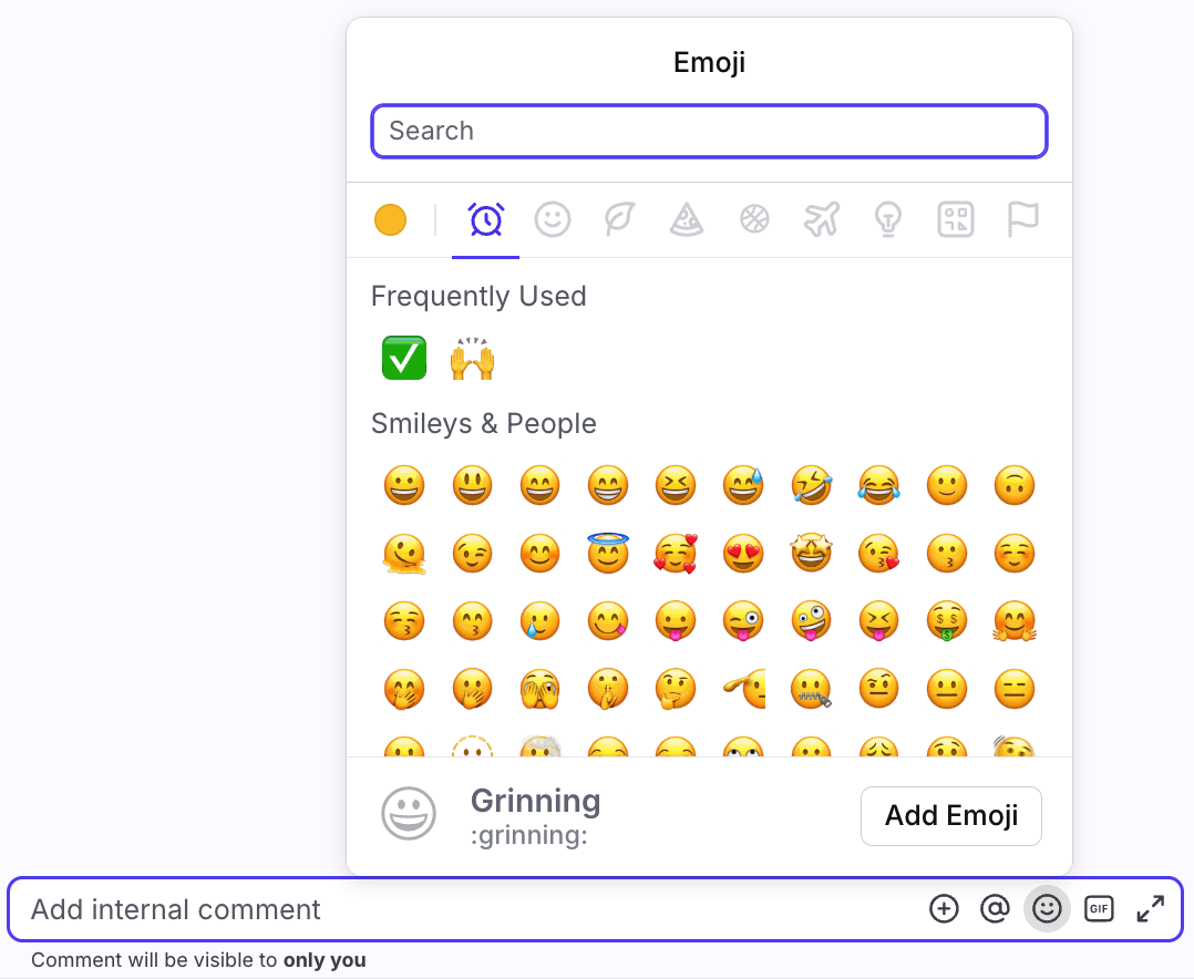 Insert emojis to liven up your comments by clicking the happy face icon, or simply type out the emoji keystrokes and press the space bar.