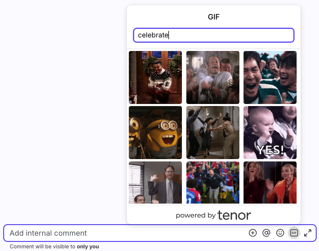 Express yourself fully with the Tenor integration built into the comment bar — simply click the GIF icon and search for the perfect gif to capture your thoughts.