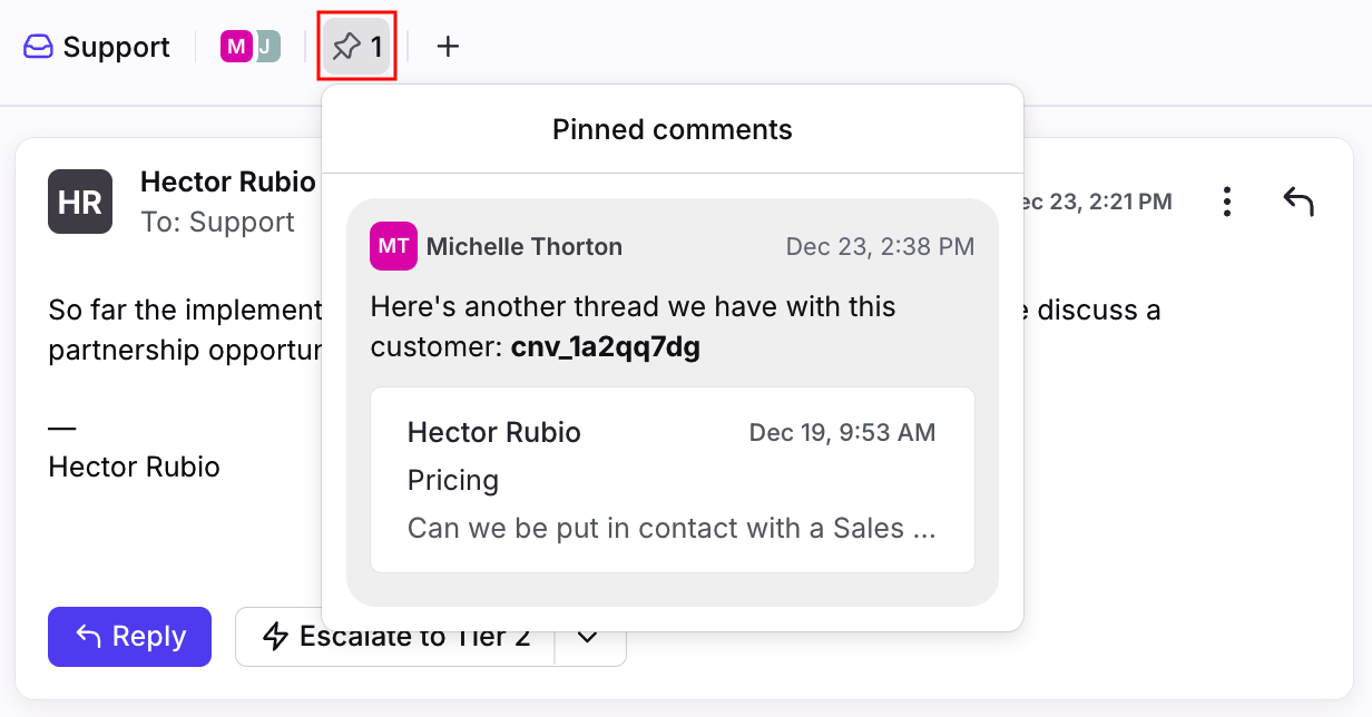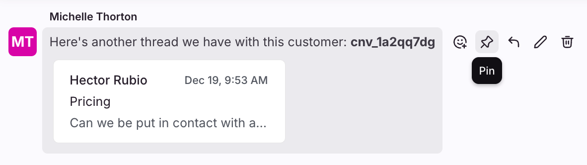 Pin comments to highlight important comments for all teammates viewing the conversation. To pin a comment, hover over the comment and click the pin icon. To unpin a pinned comment, hover over the comment and click the unpin icon.