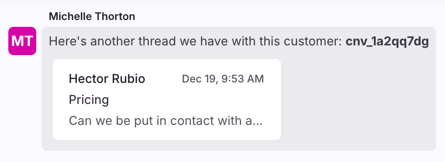 When you post comments containing a conversation or message ID/permalink, Front will automatically show a preview of that conversation or message to give you and your team helpful context at a glance. These conversation previews can be clicked to open the conversation in a popout window. Conversation previews will only be shown if the teammate viewing the comment has access to the conversation.
