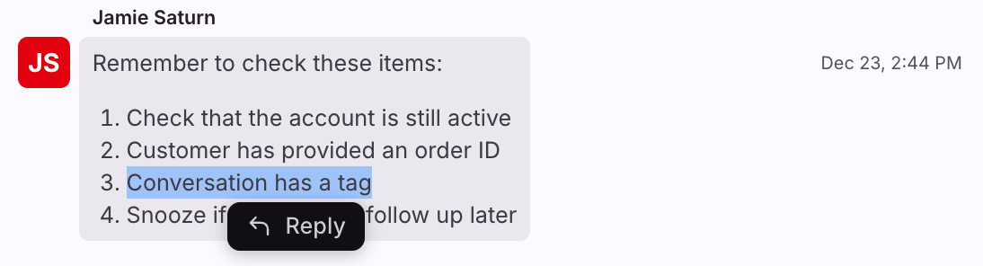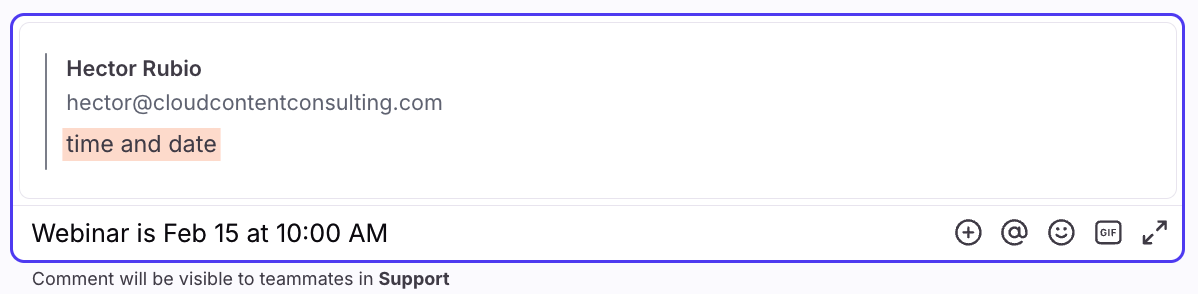 Write your internal comment. If you would like to highlight a message snippet, but don't need to add any additional comment of your own, you can post the comment without entering additional text.