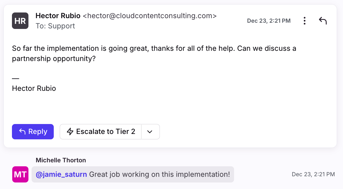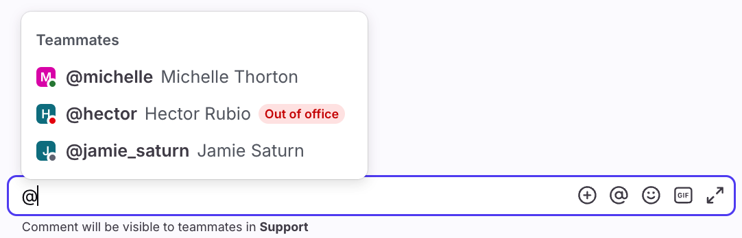 Use comments to collaborate internally with your teammates. Only your team can see posted comments, so you can discuss the conversation amongst yourselves without having to forward the message around. You can also get a specific teammate's attention using @mentions.