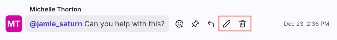 Hover to the right of the comment to see the Edit and Delete options. You can also press the up arrow on your keyboard while active in the comment composer box to edit your comment. If you click Delete, you will be prompted to confirm whether you want to delete the comment.